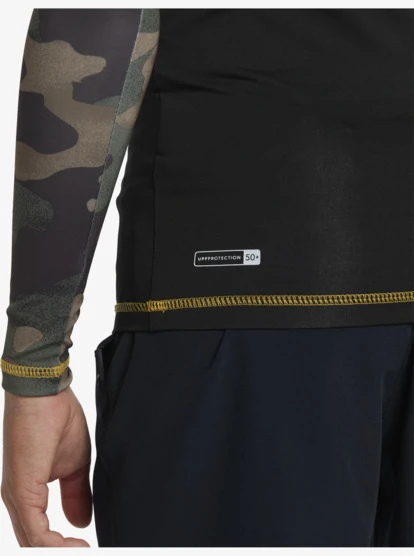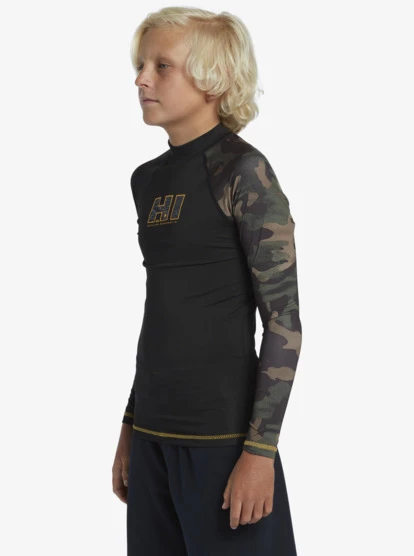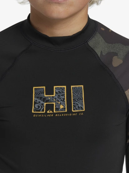 Engineered with eco-conscious SWR-Shield fabric that’s crafted of recycled yarn, the Quiksilver Boy’s Hi Island Rush Long Sleeve Rashguard offers superior sun protection, chlorine resistance and moisture-wicking comfort. This Made Better Collection rashgaurd top has a snug fit with a mock neck and Hawaii branding.